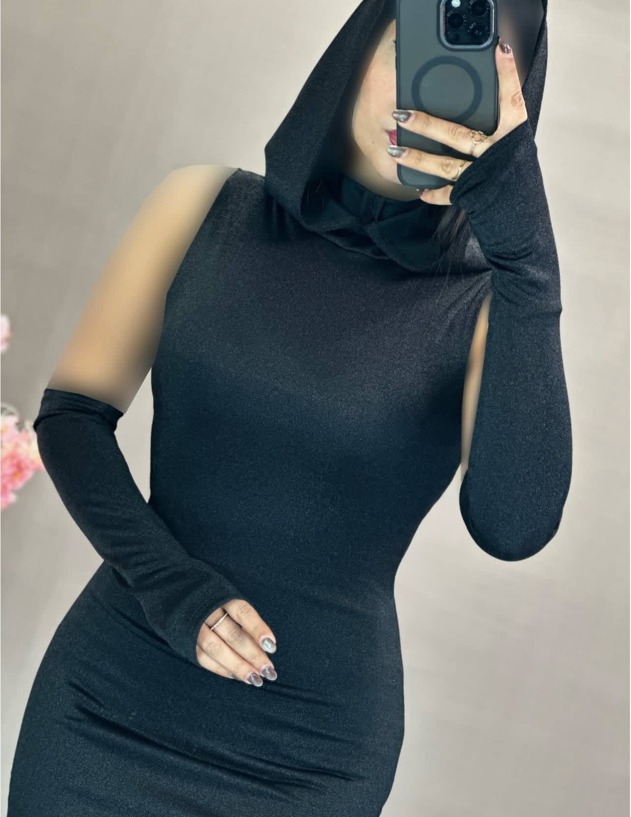 ماکسی مجلسی کلاهدار همراه با دستکش جنس کرپ لمه مورانو